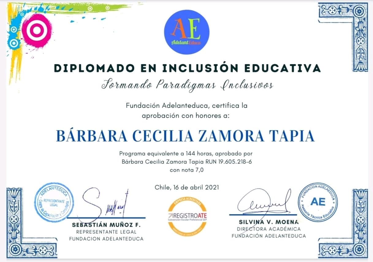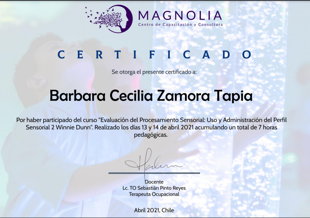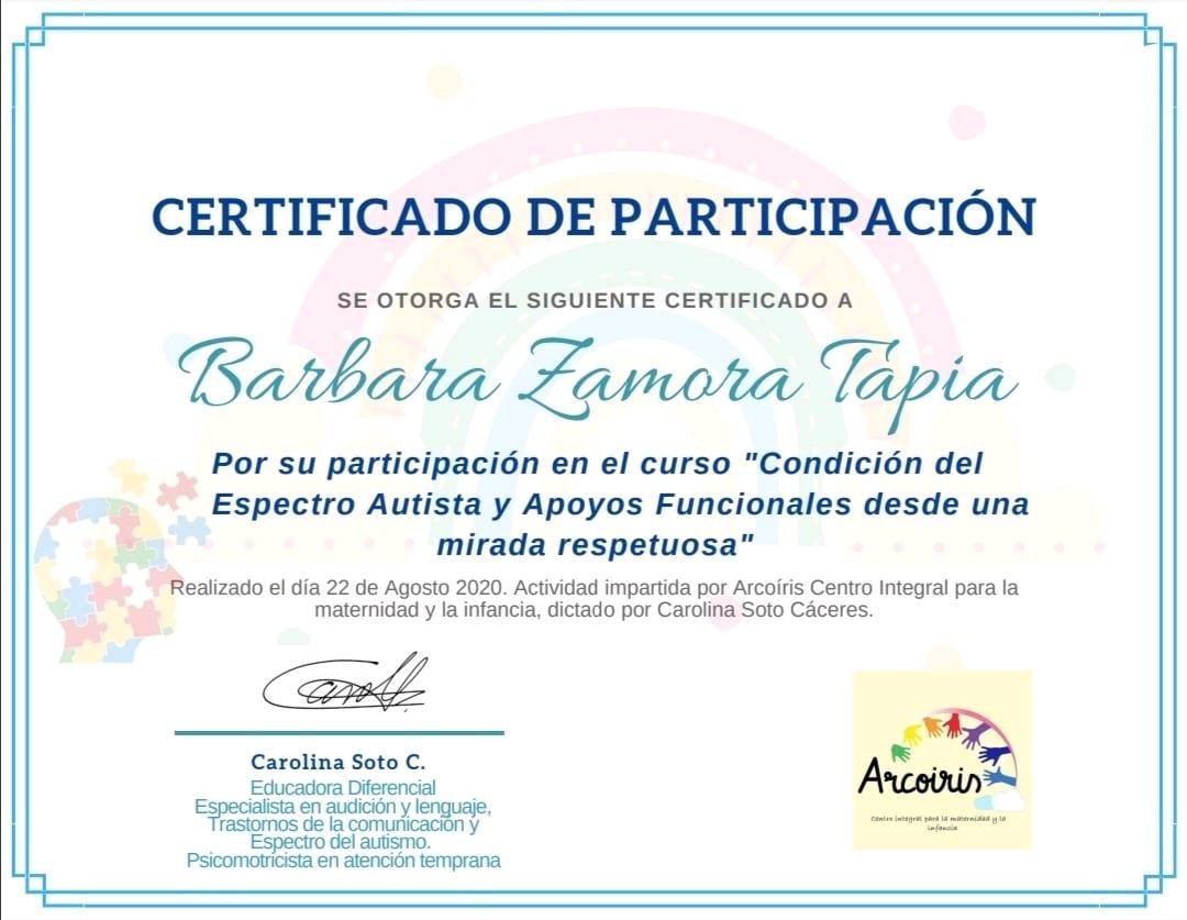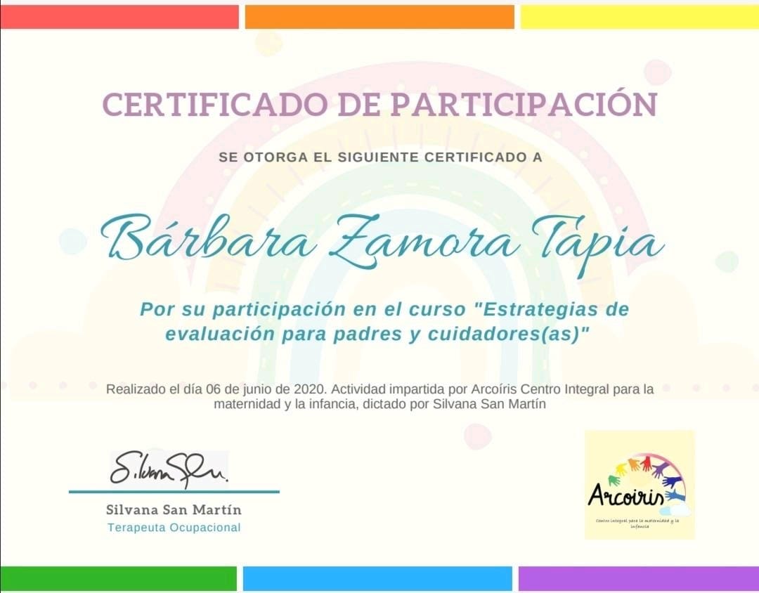 Hola mi nombre es Barbara Zamora, soy Terapeuta Ocupacional con mención en Pediatría, egresada de la Universidad de los Andes (2019), diplomada en Educación Inclusiva y certificada como tutor sombra.