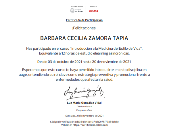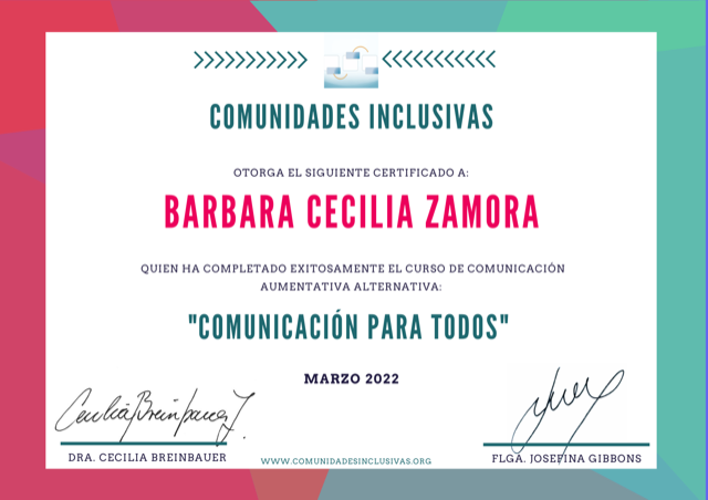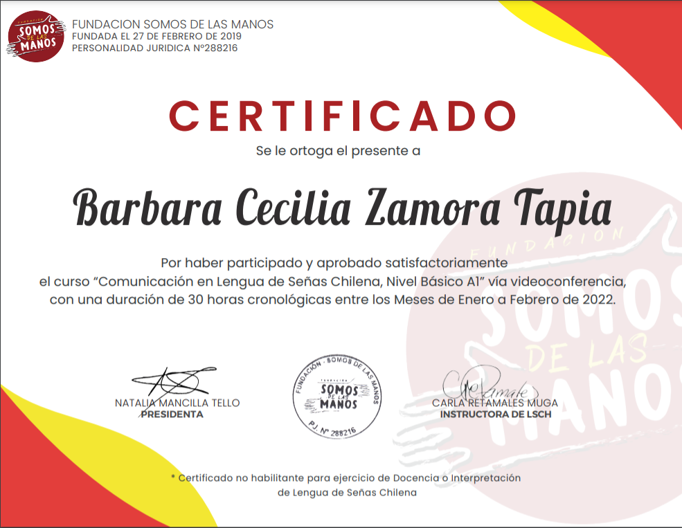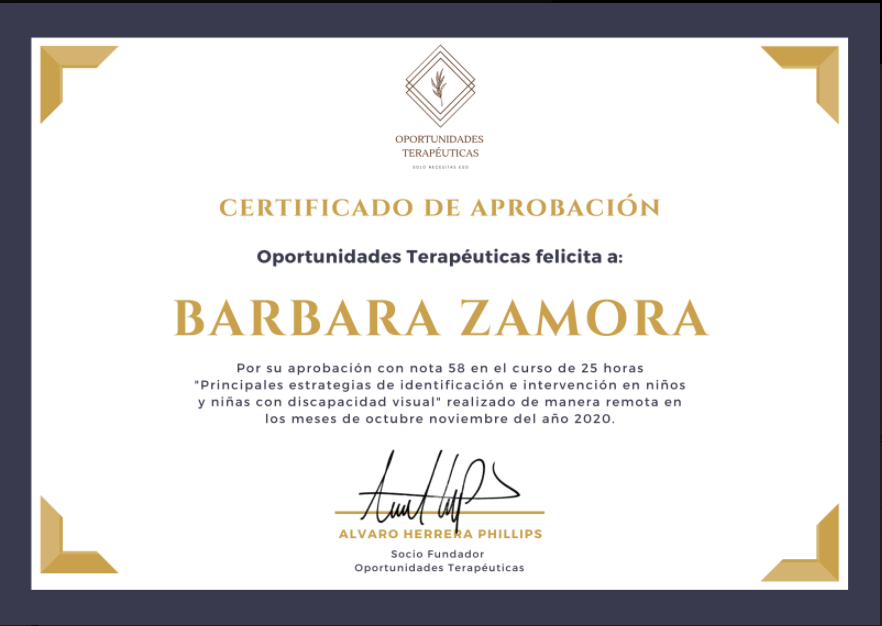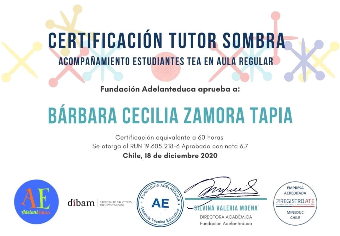 Hola mi nombre es Barbara Zamora, soy Terapeuta Ocupacional con mención en Pediatría, egresada de la Universidad de los Andes (2019), diplomada en Educación Inclusiva y certificada como tutor sombra.